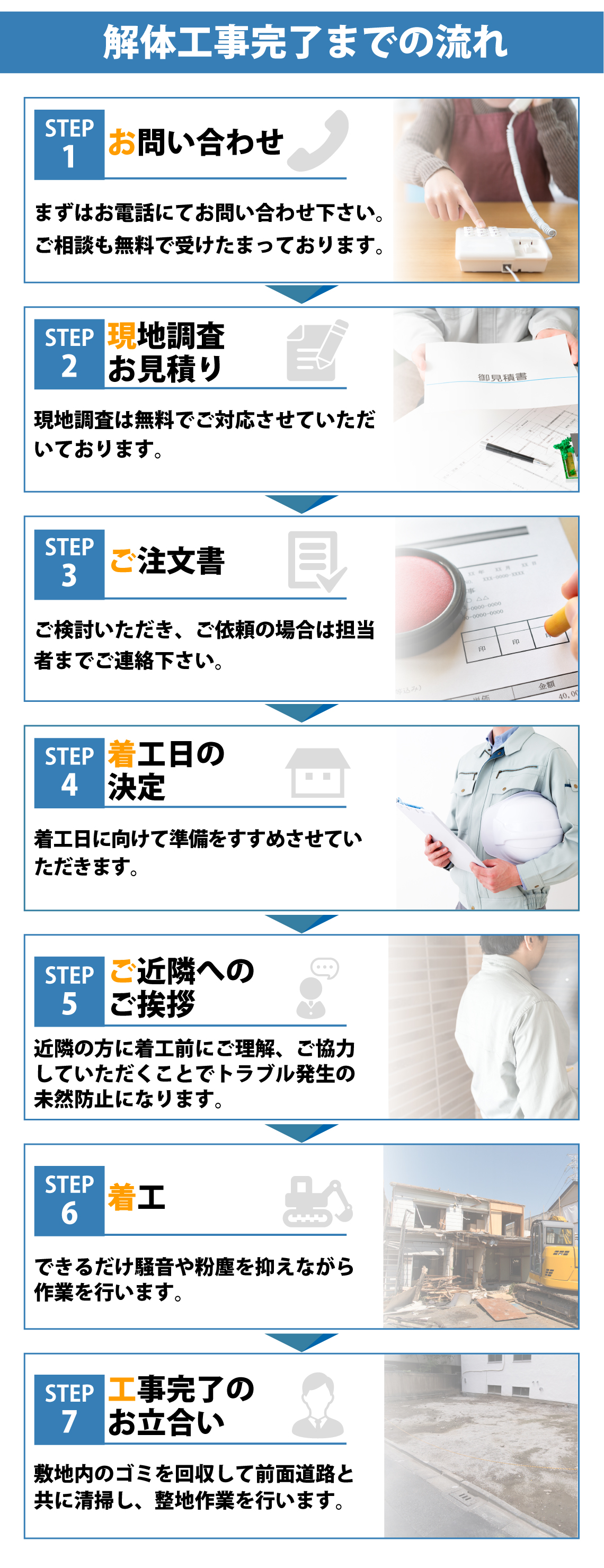 ・建設業、施工管理士、ユンボーなどの重機の操作ができる車両系建物機械運転技能講習修了証などの免許、資格、許可があるから 安心してご依頼下さい。・明朗会計でわかりやすい料金体系にしております。解体工事がはじめてで相場がわからず他社との見積り比較をされたい方も多いかと思います。当社では見積りを安く、できるだけ最安値、激安価格になるように努力いたします。見積り価格の内訳もわかりやすくし、追加費用もありません。・建物は、あらゆる工作物、構造物、木造、木造瓦葺き、木造モルタル、木造カラーベストぶき、トタン、鉄骨、鉄骨造、鉄筋、コンクリートにご対応します。・各種届出に必要な書類、契約書、申請、提出書類、登録などサービス内で行います。・ライフラインの撤去手続きも、電線の撤去は電力会社へ撤去工事の連絡をいたします。水道の閉栓の手続きも行います。ガスに関しましては、LPガスの際は着工前日までに回収手続きをお願いいたします。・解体する建物内に、処分に困る荷物、不用品が残ってしまう場合はご相談ください。・現地調査、現場調査が終了後、2~3日ほどでお見積りをお届けいたします。・スケジュールが合わない場合、契約書を郵送して契約を交わすことも可能です。・熟練の管理者、作業員が徹底した安全管理を行います。・振動、騒音対策、粉じんの対策を行うためにしっかりと養生を行います。・ご近隣、ご近所の方へのご挨拶、クレーム時の対応など的確に行い、住民の方へのご迷惑を最小限にいたします。また、工事の概要、工期を細かくお知らせし解体工事により与えてしまうかもしれない被害について事前にお伝え致します。・予定した工期が遅れないように期間内で作業を完了するように勤めます。・自然災害の影響や、地中埋設物の発見などで工期延長がやむを得なくなる場合がありますが、都度ご連絡させていただきます。・敷地外の清掃作業もきちんと行い、作業員の服装や態度についても清潔、誠実を保つようにしっかりと管理いたします。・建物の解体自体が済んだあと、敷地内のゴミを回収して前面道路と共に清掃し、整地作業(敷地の凸凹を滑らかにするため重機で踏み固めていく作業)・お支払いが終わりましたら、建物滅失登記に必要な滅失証明書をお渡しいたします。
